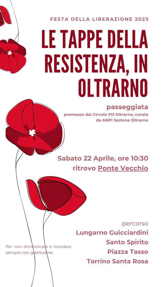 Ore 10.30: 𝗟𝗲 𝘁𝗮𝗽𝗽𝗲 𝗱𝗲𝗹𝗹𝗮 𝗿𝗲𝘀𝗶𝘀𝘁𝗲𝗻𝘇𝗮, 𝗶𝗻 𝗢𝗹𝘁𝗿𝗮𝗿𝗻𝗼, passeggiata promossa dal Circolo PD Oltrarno. Ritrovo presso Ponte Vecchio con percorso Lungarno-Guicciardini-Santo Spirito-Piazza Tasso-Torrino Santa Rosa.