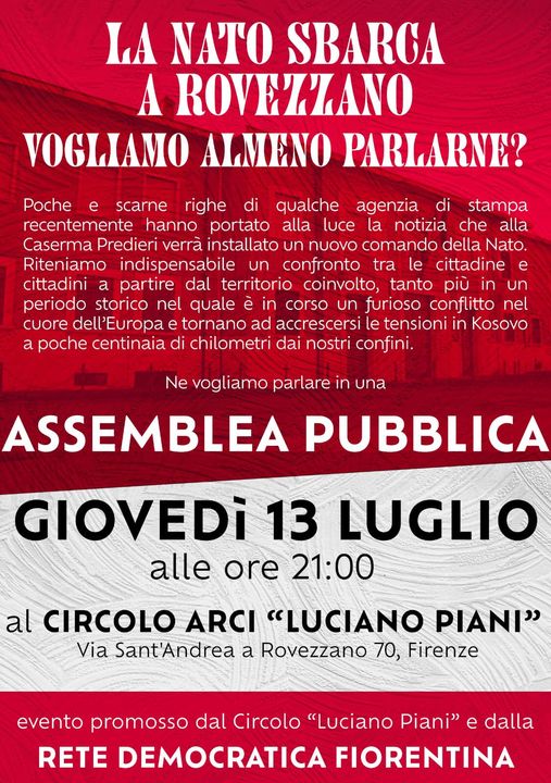 Ore 21.00: Invitiamo tutti gli interessati alla (e/o preoccupati dalla) presenza del nuovo comando NATO a Rovezzano a partecipare all’assemblea promossa dalla Rete Democratica Fiorentina.