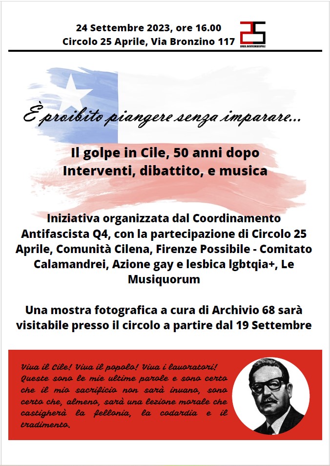 Ore 16:00, Circolo 25 Aprile: “È proibito piangere senza imparare… Il golpe in Cile, 50 anni dopo. Interventi dibattito e musica”