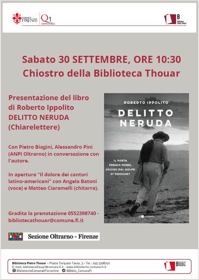 Ore 10:30, Chiostro della Biblioteca Thouar: Presentazione del libro di Roberto Ippolito “Delitto Neruda”, con Pietro Biagini e Alessandro Pini (ANPI Oltrarno) in conversazione con l’autore.