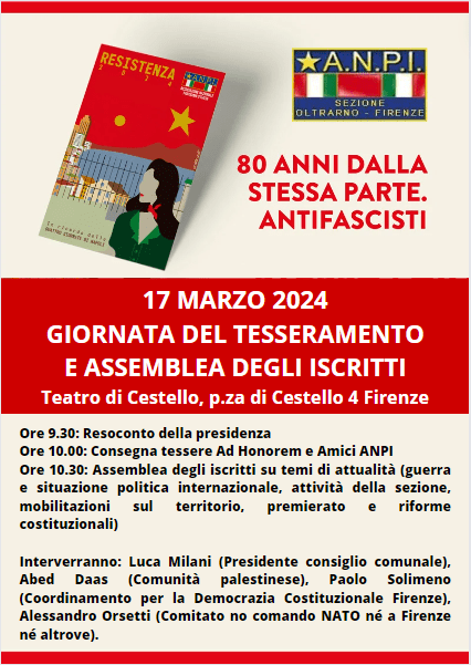 Domenica 17 Marzo 2024, presso il Teatro di Cestello (p.za di Cestello 4 Firenze), si terrà la Giornata del tesseramento e Assemblea degli iscritti della sezione Oltrarno, dove sarà possibile rinnovare la tessera per l’anno 2024.