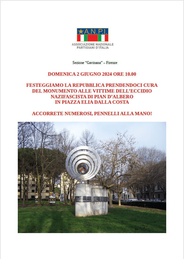 In collaborazione con la sezione ANPI Gavinana, festeggeremo la Repubblica prendendoci cura del monumento alle vittime dell’eccidio di Pian d’Albero.