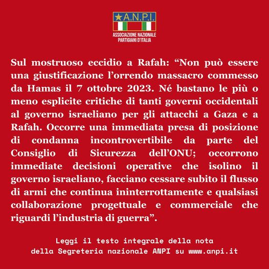 Condividiamo il comunicato dell’ANPI Nazionale sull’ennesimo massacro di civili avvenuto a Rafah ad opera dell’IDF. https://www.anpi.it/sul-mostruoso-eccidio-rafah-non-puo-essere-una-giustificazione-lorrendo-massacro-commesso-da-hamas Condividi: Fai clic per condividere su X (Si apre in una nuova finestra) X Fai clic per condividere su Facebook (Si apre in una nuova finestra) Facebook Mi piace Caricamento... Correlati