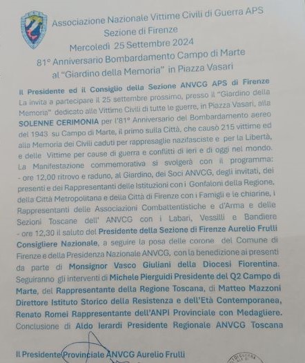 Ore 12.30: Cerimonia di commemorazione al “Giardino della Memoria” in Piazza Vasari. Condividi: Fai clic per condividere su X (Si apre in una nuova finestra) X Fai clic per condividere su Facebook (Si apre in una nuova finestra) Facebook Mi piace Caricamento... Correlati
