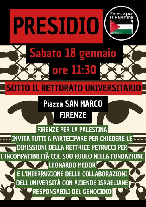 Riguardo a quest’ultimo punto, segnaliamo l’appuntamento di domani mattina (Sabato 18, ore 11.30) in piazza San Marco, iniziativa organizzata all’interno delle giornate di mobilitazione nazionale contro la filiera della guerra e la complicità del nostro governo con il genocidio e l’occupazione.