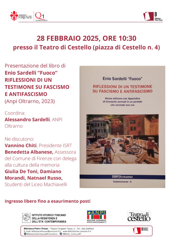 Ore 10.30, presso il Teatro di Cestello: Primo appuntamento del ciclo INCONTRI SULLA RESISTENZA con la presentazione del libro di Enio Sardelli “Fuoco” Riflessioni di un testimone su fascismo e antifascismo.