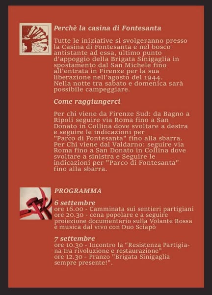 Anche quest’anno ci rivediamo a settembre alla casina di Fontesanta, punto di appoggio della brigata Sinigaglia prima della liberazione di Firenze.