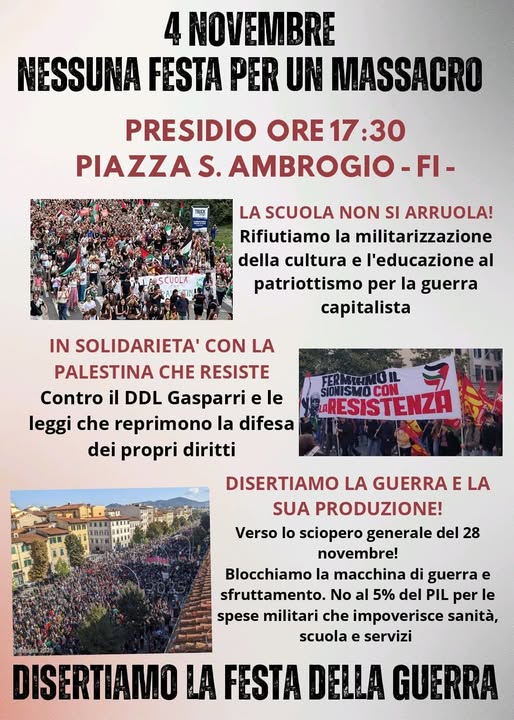 Ore 17.30, piazza S.Ambrogio: rilanciamo il presidio chiamato per oggi in S.Ambrogio contro la militarizzazione delle scuole, in solidarietà con la Palestina, e contro l’aumento delle spese militari.
